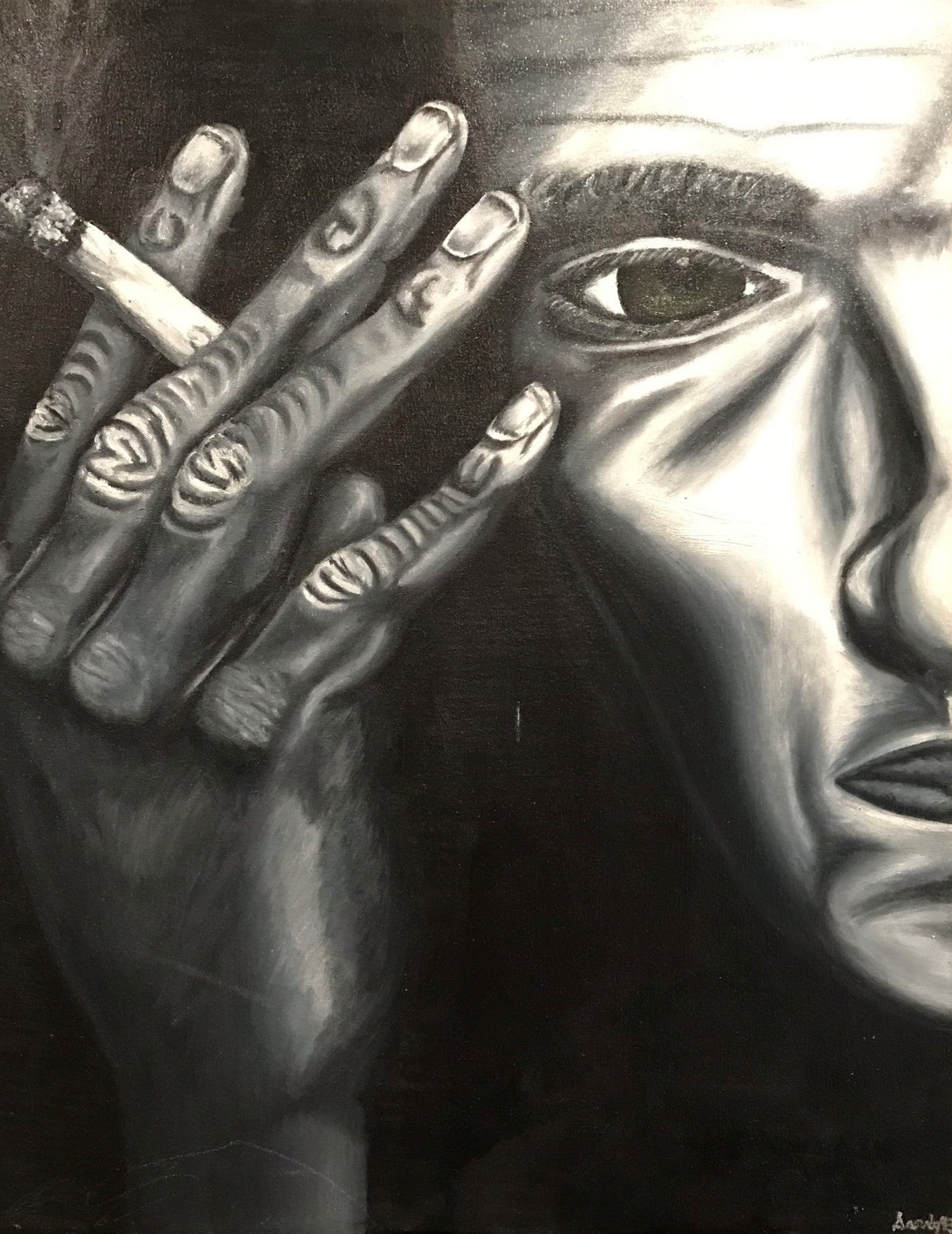 "Deep Thoughts" was a fun painting to paint. It's a simple concept of a man smoking a cigarette. However, the seriousness of his gaze, the hand at his temple, and the single burning cigarette display a person with a lot on their mind. Hence, the deep thoughts.
