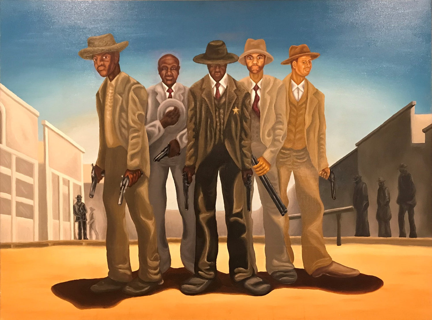 This painting was inspired by Kadir Nelson's, an award-winning American artist, depiction of "High Noon." My client loved this painting so much that he asked to have his likeness and that of his best mates to be the focal subjects of this replica.